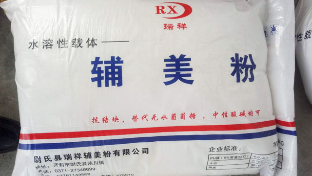 目前,国内多数兽药厂使用的兽药载体“葡萄糖”价格高、致使兽药产品成本加大、且易吸潮、结块、流动性差,与药物不易混合均匀。而且甜味重,许多动物不爱进食和饮食,使进入动物体内的药剂量达不到要求,影响治疗效果。而辅美粉由于经过了高温等特殊工艺处理,不含结晶水和游离水,可封存5年不结块,流动性如故,生产利用率可达100%,且混合后的药物适宜动物进食,完全为兽药厂家解除了这方面的困扰。实践证明其性能完全优于无水葡萄糖,而且辅美粉还具有各种单一颜色(白、黄及根据要求定做其它颜色),在使用上减少很多配比上色的麻烦。